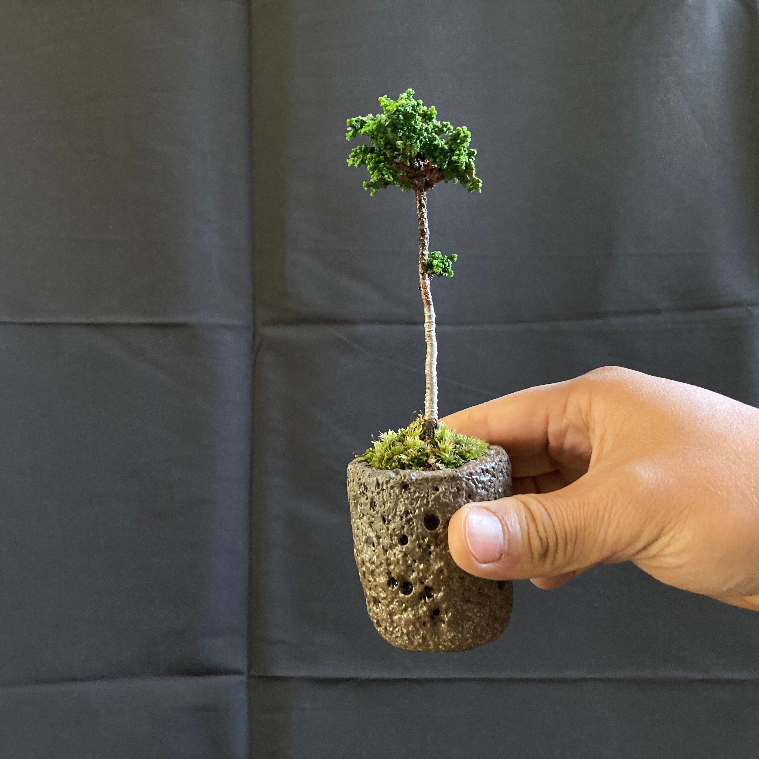 微粒赤玉土、ひゅうが土、籾殻腐葉土、ヒメオキナゴケ使用。鉢の素材はテラコッタです。