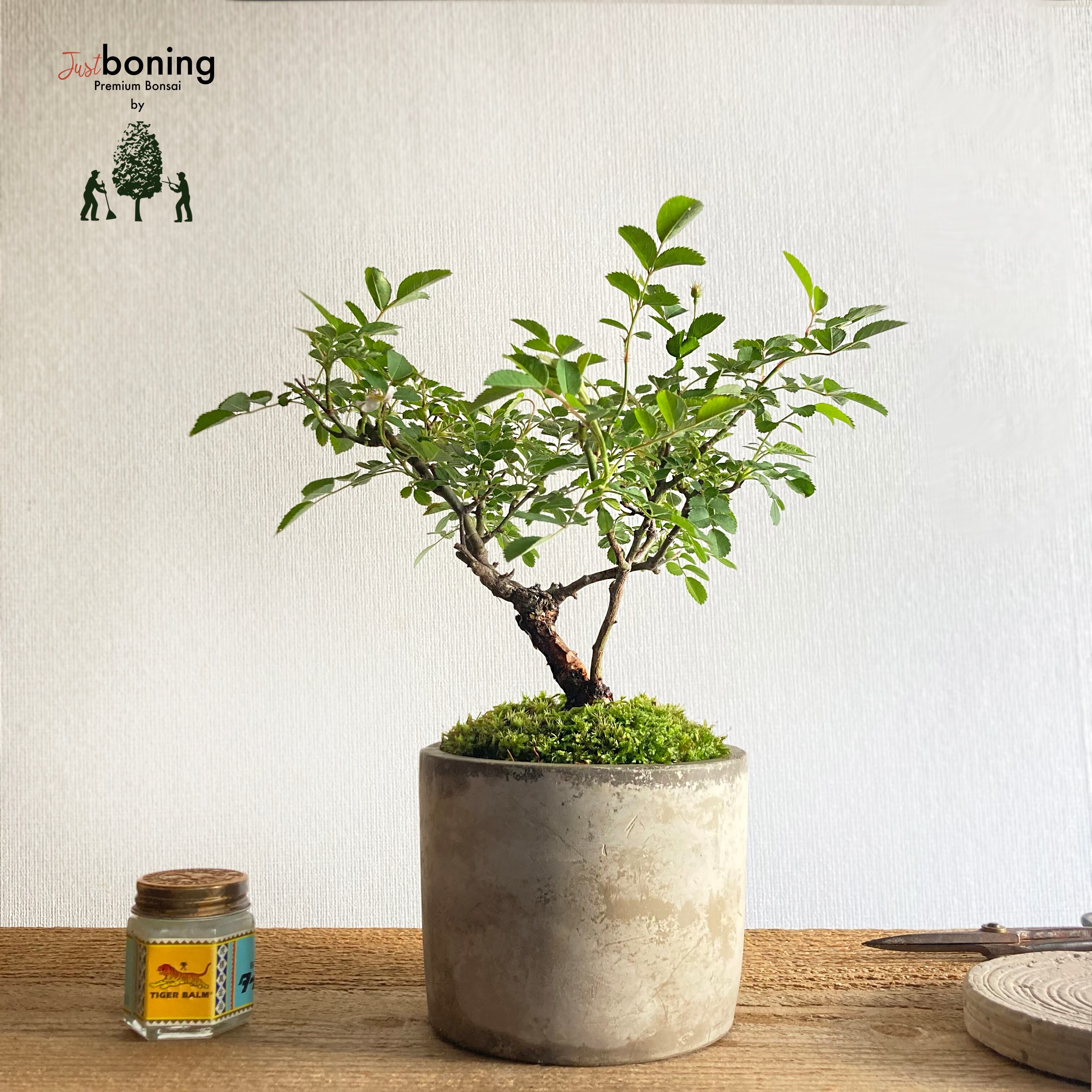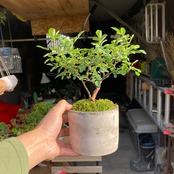 微粒赤玉土、ひゅうが土、籾殻腐葉土、ヒメオキナゴケ使用。鉢の素材は黒土化粧泥です。