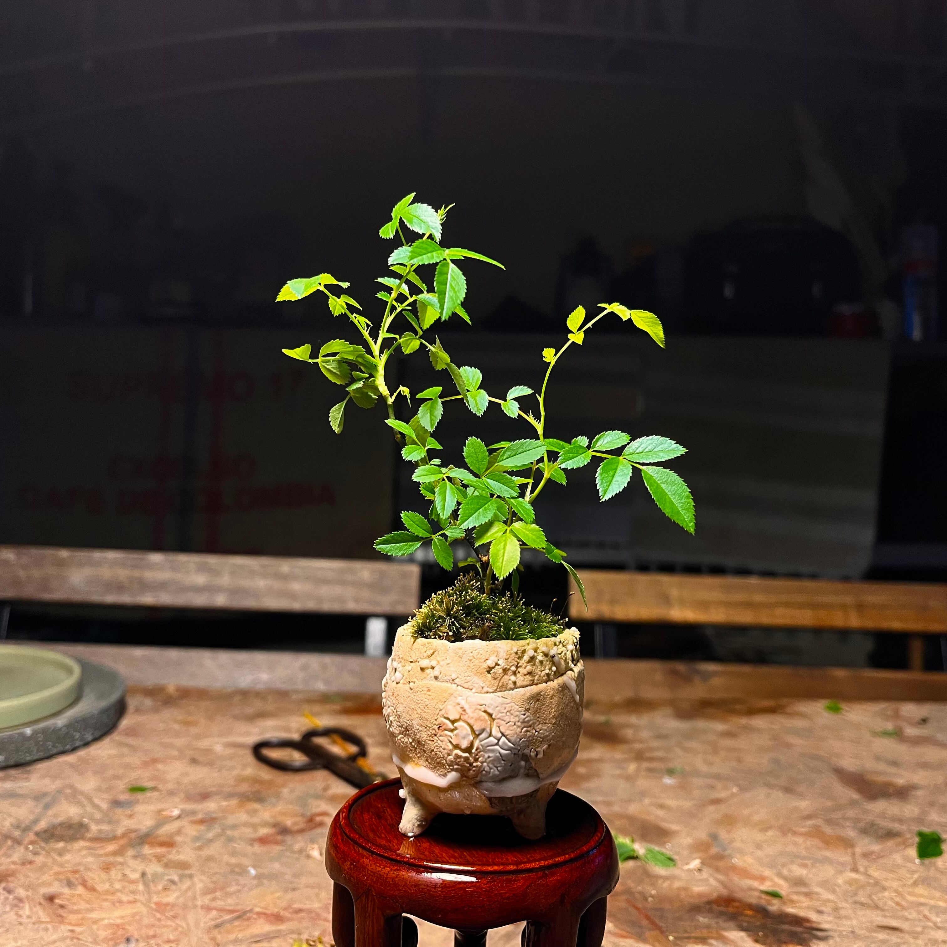 雅薔薇 beanpot by YOYO窯Cは、指先サイズのミニ薔薇の盆栽です。一点物の手捻りの鉢に植えられ、春から初夏にかけて美しい花を咲かせます。稀に秋にも開花する場合もあります。