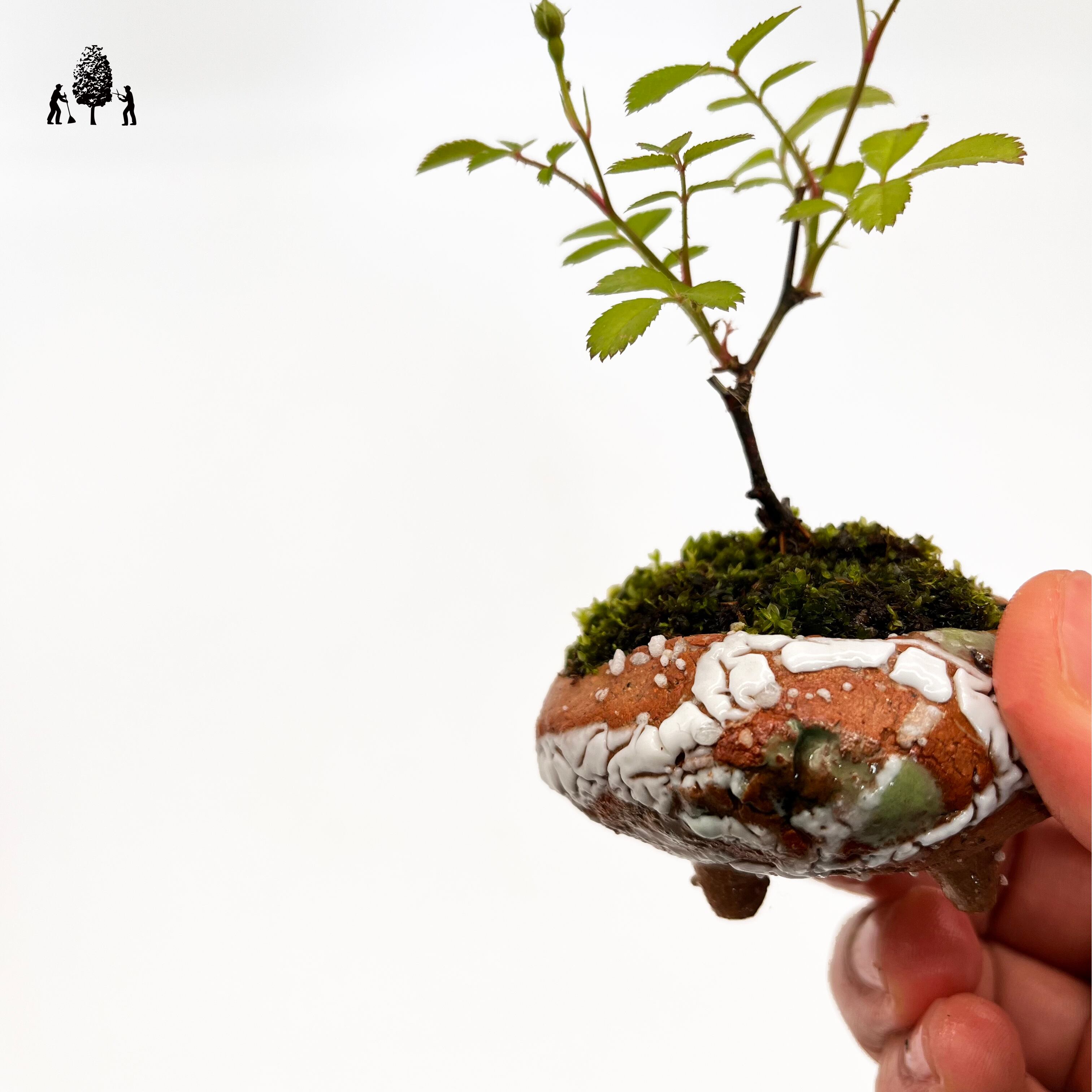 雅薔薇 beanpot by YOYO窯Gは、一点物の手捻りの鉢に植えられた指先サイズのミニ薔薇の盆栽です。春から初夏にかけて華やかなピンクの花を咲かせる美しい植物ですが、秋にも咲くことがあり、季節を問わず庭やお部屋で楽しめます。この雅薔薇は、日本の窯元YOYO窯とのコラボレーション作品であり、伝統の技が活かされた鉢から、丁寧に育成されたミニ薔薇まで、すべてが一つ一つ手作業で丁寧に作られています。