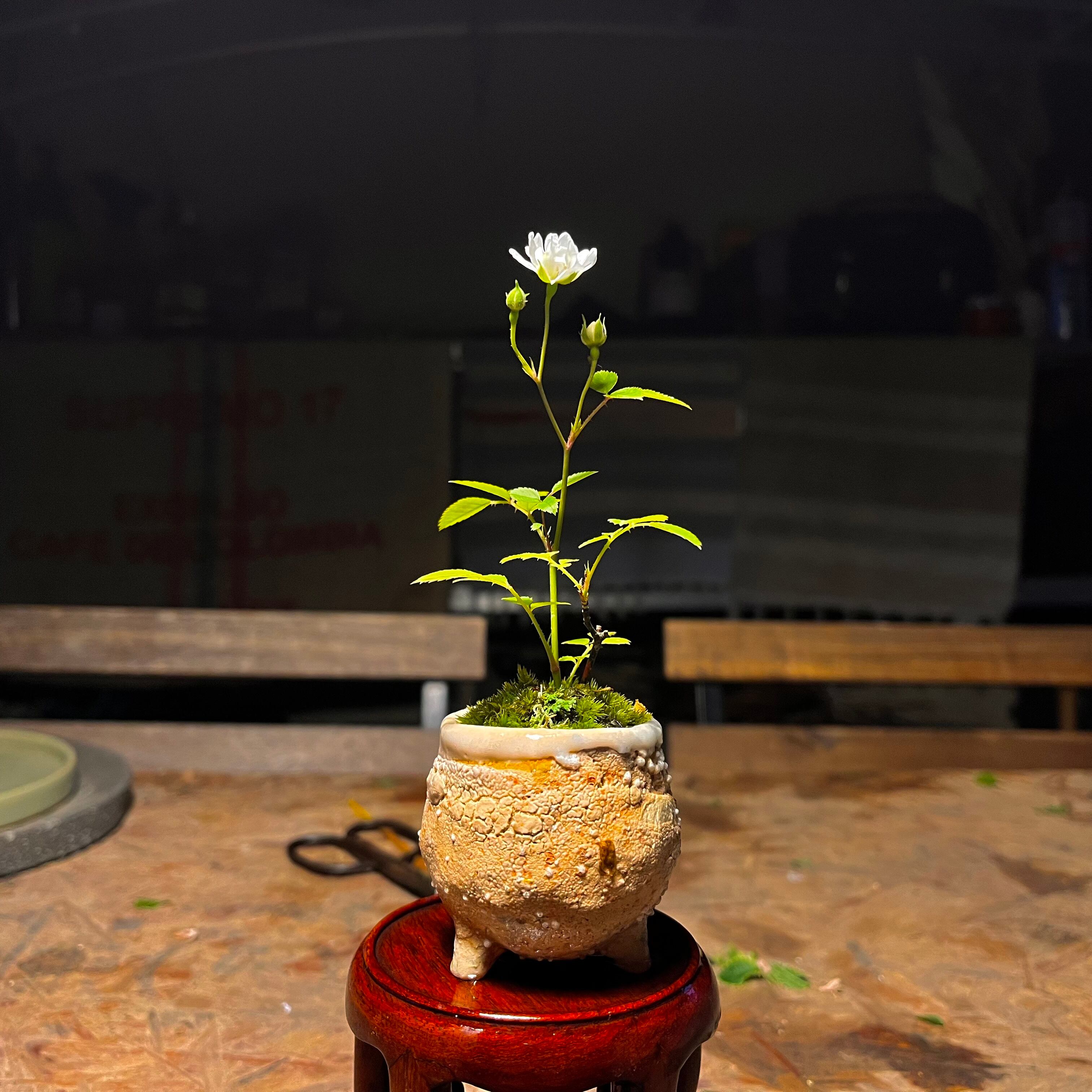 雅薔薇 beanpot by YOYO窯Hは、一点物の手捻りの鉢に植った指先サイズのミニ薔薇の盆栽です。春から初夏にかけては可憐に花を咲かせ、稀に秋にも開花するため季節を問わず楽しめます。