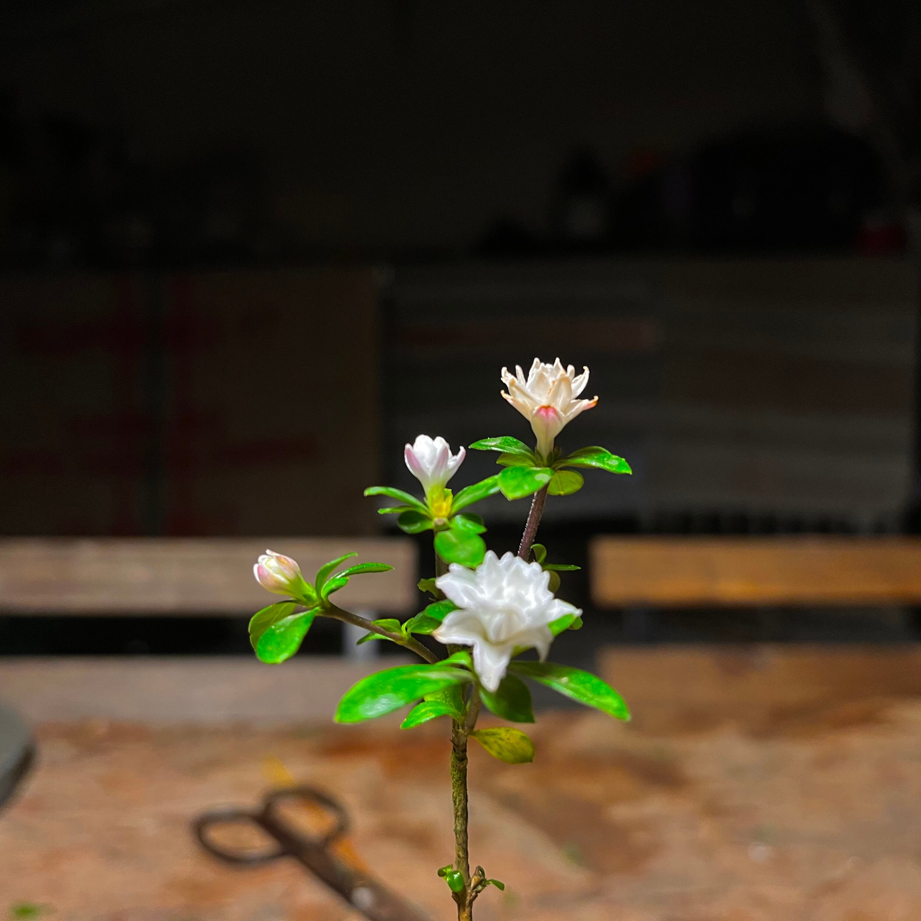 指先サイズの手捻り鉢に植えられた、白丁花の盆栽です。春から初夏にかけて咲く可愛らしい花は、小さな空間でも癒しを与えてくれます。また、稀に秋にも開花するため、1年中飾ることができる一点物となっています。