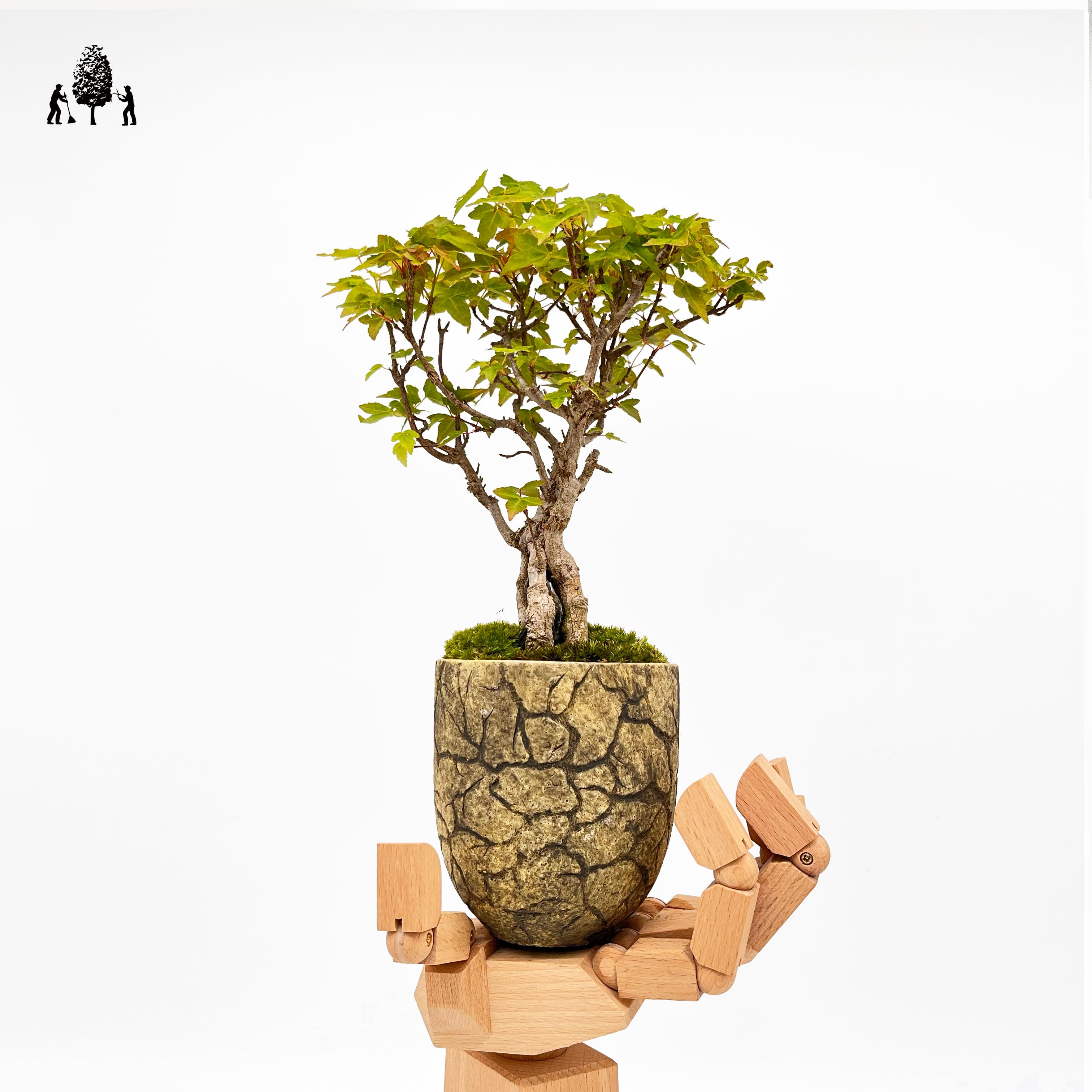 根に石を咬ませその後足元を茎化させた石咬樹形のカエデです。新芽の赤と新緑が混ざった春も綺麗ですが秋の紅葉も美しいです。